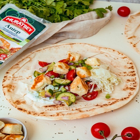 ladenbrot in der Pfanne oder im Sandwichmaker erwärmen.Joghurt auf das Fladenbrot streichen.Gurken, Tomaten, Blattsalat, rote Zwiebel und Frühlingszwiebel darauflegen. Muratbey Barbecue Käse 5 Minuten in der Pfanne anbraten und hinzufügen. Fladenbrot einrollen und servieren.