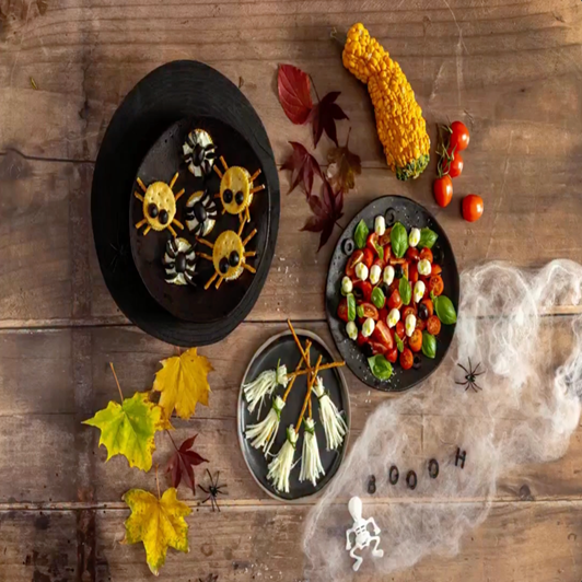 Halbieren Sie einige der Oliven und schneiden Sie den Rest in dünne Scheiben. Bestreichen Sie die Cracker mit Muratbey Kaymaklı, legen Sie eine Olive in die Mitte und ordnen Sie die dünn geschnittenen Oliven seitlich als Beine an. Bereiten Sie anschließend die Hexenbesen zu: Teilen Sie den Muratbey Tel Käse in kleine Stücke, stecken Sie oben eine Salzstange hinein und binden Sie den Käse mit einem dünnen Petersilienstiel zusammen, um die Besenform zu erhalten. Für den Salat halbieren Sie die Kirschtomaten, mischen Sie sie mit Muratbey Topi und frischem Basilikum, geben Sie schwarze Oliven hinzu und würzen Sie alles mit Olivenöl, Salz und Pfeffer. Richten Sie zum Schluss alles auf Servierplatten an und servieren Sie es.