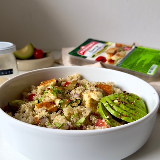 Spülen Sie die Quinoa gründlich mit reichlich Wasser. Kochen Sie sie mit 2 Gläsern Wasser, und sobald das Wasser aufgesogen ist, nehmen Sie den Topf vom Herd und lassen Sie die Quinoa abkühlen. Legen Sie den Muratbey Barbecue Käse für 15 Minuten in lauwarmes Wasser. Danach den Käse in einer Grillpfanne von beiden Seiten goldbraun anbraten. Schneiden Sie die Tomate, Gurke und die rote Zwiebel in kleine Würfel. Halbieren Sie die Avocado und schneiden Sie sie in dünne Scheiben. Geben Sie die Quinoa in eine große Schüssel. Fügen Sie das geschnittene Gemüse, den Muratbey Barbecue Käse und die fein gehackten Kräuter hinzu. Beträufeln Sie alles mit Olivenöl, Zitronensaft, Salz und schwarzem Pfeffer. Legen Sie die Avocadoscheiben an den Rand. Zum Schluss mit Paprikaflocken bestreuen und servieren.